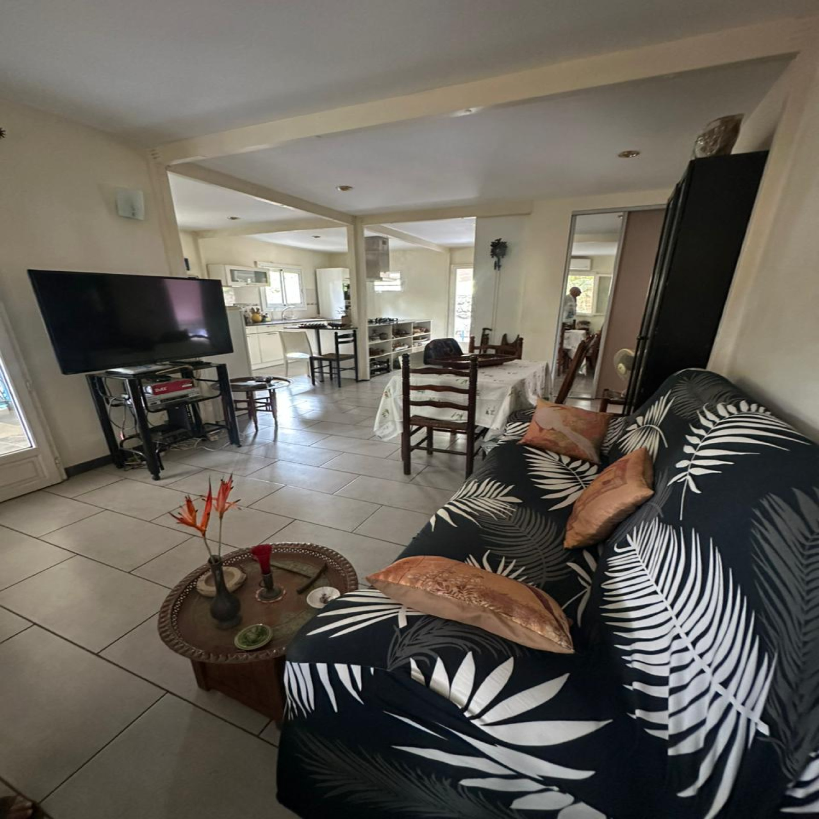 L’espace de vie se compose d’une cuisine entièrement aménagée et équipée, aux nombreux rangements, s’ouvrant sur un séjour / salle à manger lumineux.