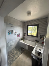 À l’étage, vous découvrirez un vaste séjour lumineux, une cuisine équipée, trois chambres dont une suite parentale, ainsi qu’une salle de douche et des WC séparés.