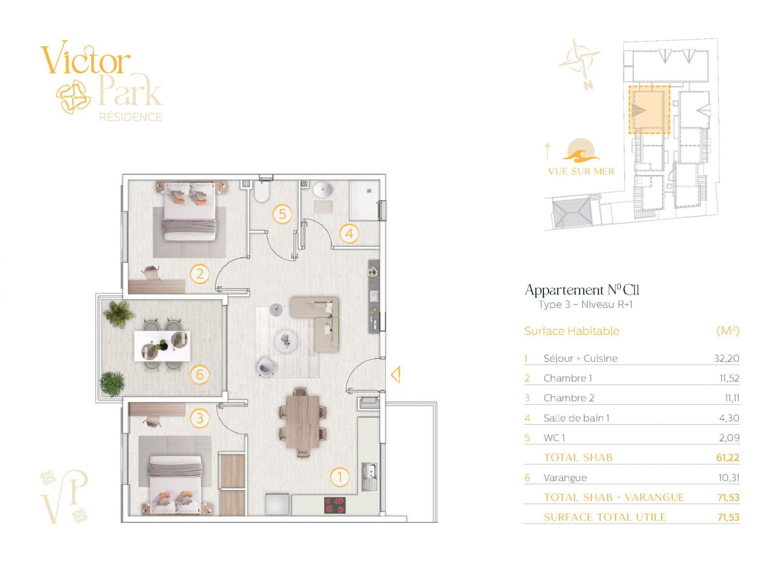 Appartement 3 pièce(s) 2 chambre(s) 61.22 m²